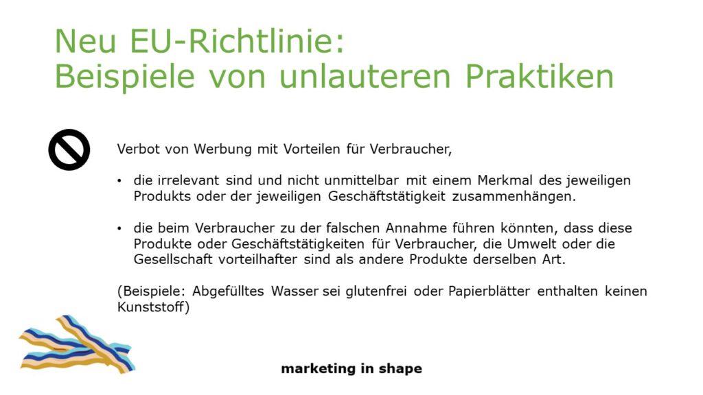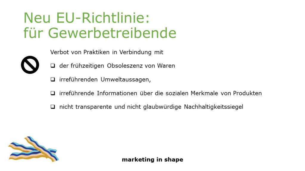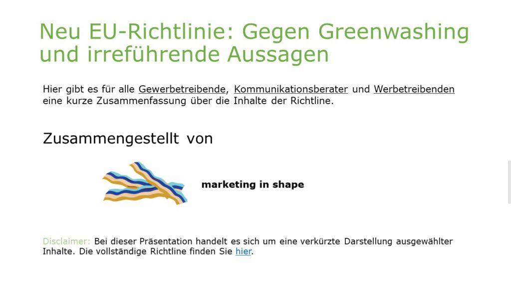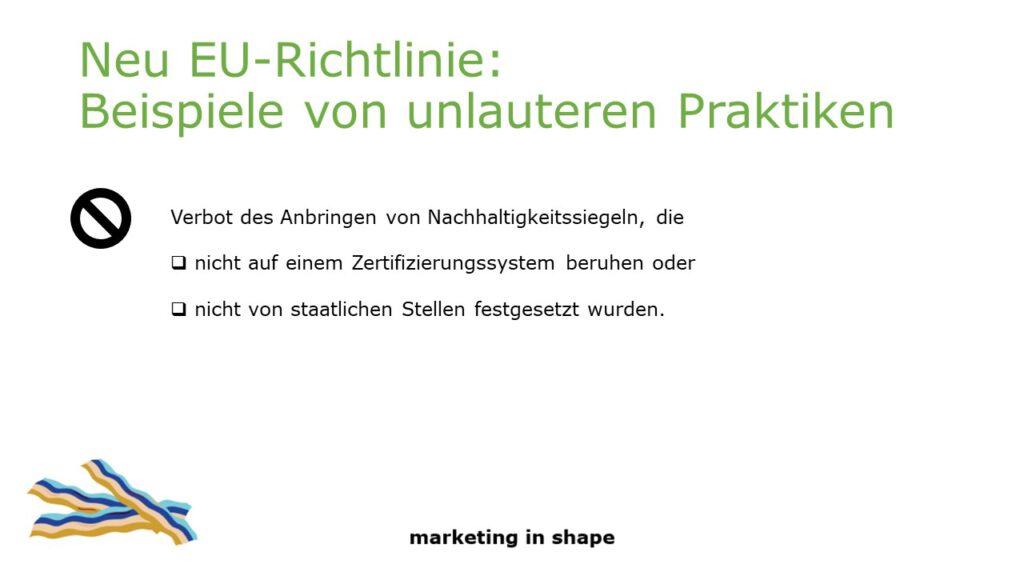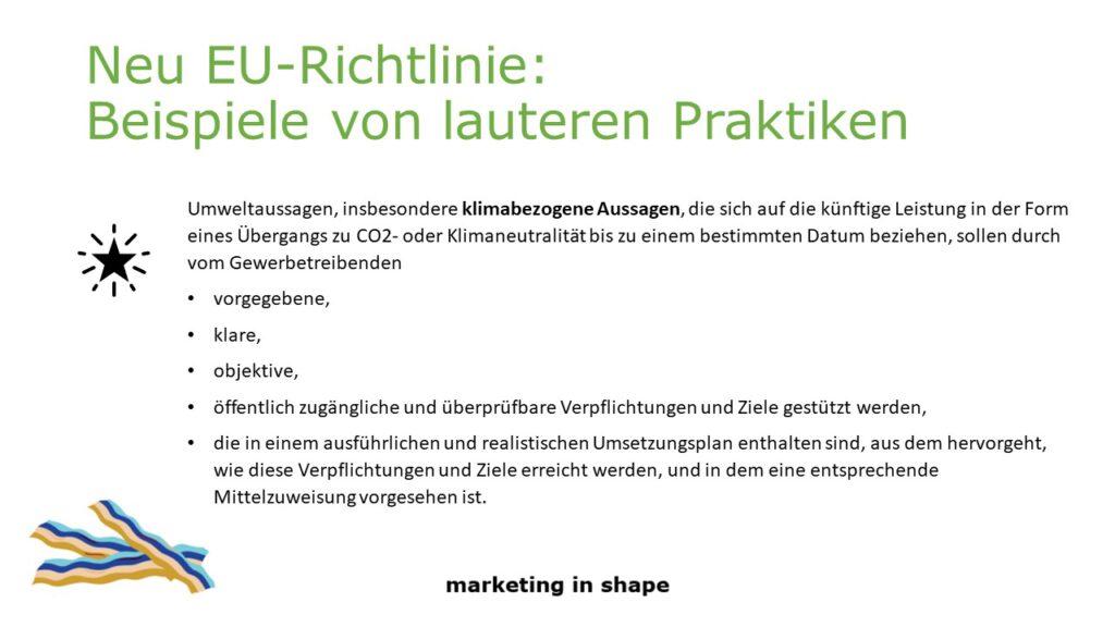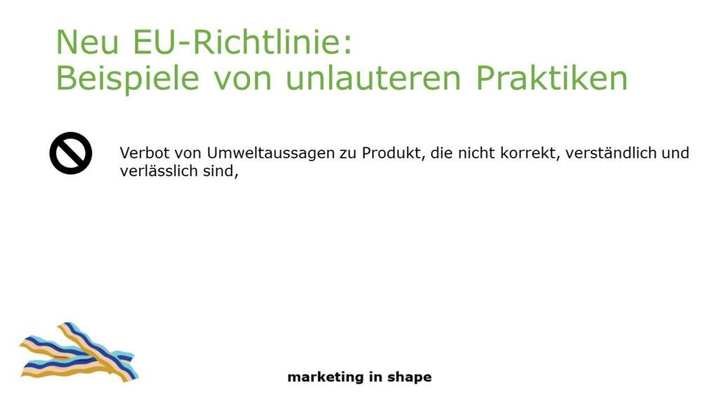 Grundsätzlich sollen mit der EU-Richtlinie gegen Greenwashing Praktiken verhindert werden, die in Verbindung mit der frühzeitigen Obsoleszenz von Waren, irreführenden Umweltaussagen zu Produkten, Informationen über die sozialen Merkmale von Produkten sowie nicht transparente und nicht glaubwürdige Nachhaltigkeitssiegeln gebracht werden.
