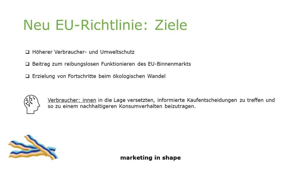 Die Richtlinie zielt auf einen höheren Verbraucher- und Umweltschutz ab. Da es sich um eine EU-Richtlinie handelt soll diese für einen Standardisierung der Maßnahmen gegen Greenwashing und somit einen Beitrag zum reibungslosen Funktionieren des EU-Binnenmarkts leisten. Da Nachhaltigkeit in der Wirtschaft und bei den Unternehmen ein Megatrend ist, soll der ökologische Wandel der Wirtschaft europaweit voranschreiten und der Green Deal vorankommen. Verbraucher: innen sollen mit der Richtlinie stärker in die Lage versetzt werden, informierte Kaufentscheidungen zu treffen und so zu einem nachhaltigeren Konsumverhalten beizutragen.