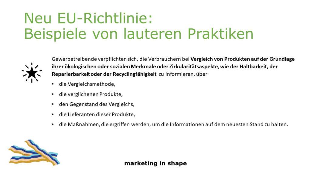 Gewerbetreibende verpflichten sich, die Verbrauchern bei Vergleich von Produkten auf der Grundlage ihrer ökologischen oder sozialen Merkmale oder Zirkularitätsaspekte, wie der Haltbarkeit, der Reparierbarkeit oder der Recyclingfähigkeit zu informieren, über die Vergleichsmethode, die verglichenen Produkte, den Gegenstand des Vergleichs, die Lieferanten dieser Produkte sowie die Maßnahmen, die ergriffen werden, um die Informationen auf dem neuesten Stand zu halten.