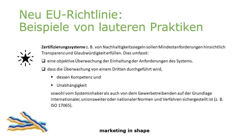 Zertifizierungssysteme für zum Beispiel Nachhaltigkeitssiegeln sollen Mindestanforderungen hinsichtlich Transparenz und Glaubwürdigkeit erfüllen. Dies umfasst eine objektive Überwachung der Einhaltung der Anforderungen des Systems. Die Überwachung muss von einem Dritten durchgeführt wird, dessen Kompetenz und Unabhängigkeit sowohl vom Zertifizierungssystem-Inhaber als auch von dem Gewerbetreibenden auf der Grundlage internationaler, EU-weiter oder nationaler Normen und Verfahren sichergestellt ist (z. B. ISO 17065).