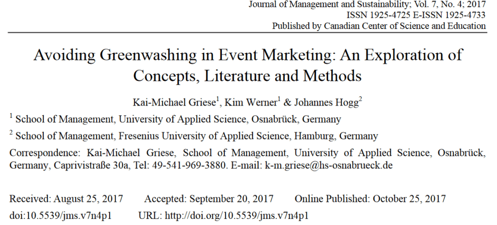 Griese, K.-M., Werner, K. & Hogg, J. (2017) Avoiding Greenwashing in Event Marketing: An Exploration of Concepts, Literature and Methods, Journal of Management and Sustainability, Vol 7, No 4, pp. 1–15, http://dx.doi.org/10.5539/jms.v7n4p1.